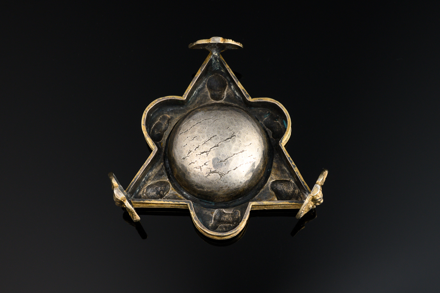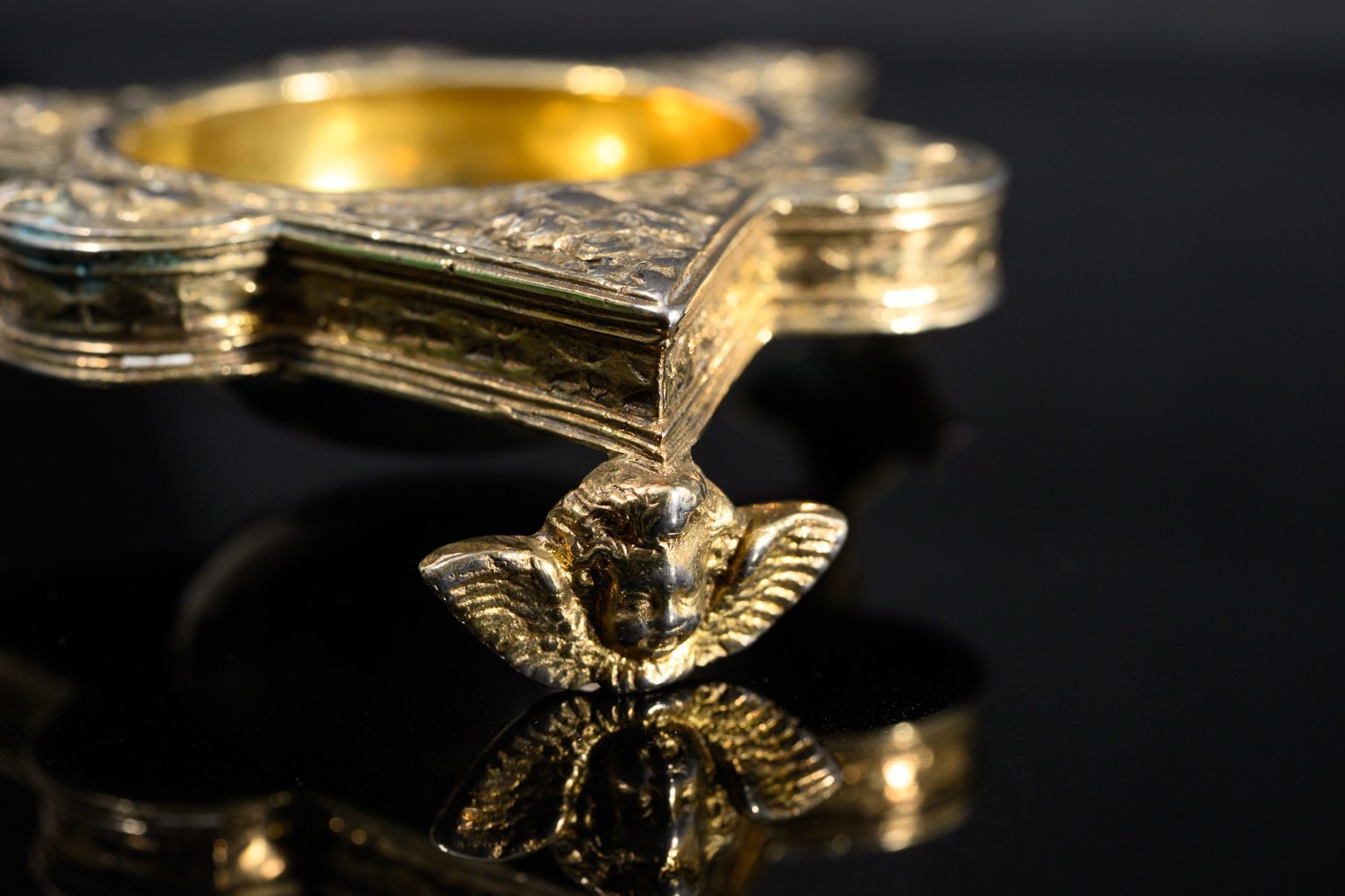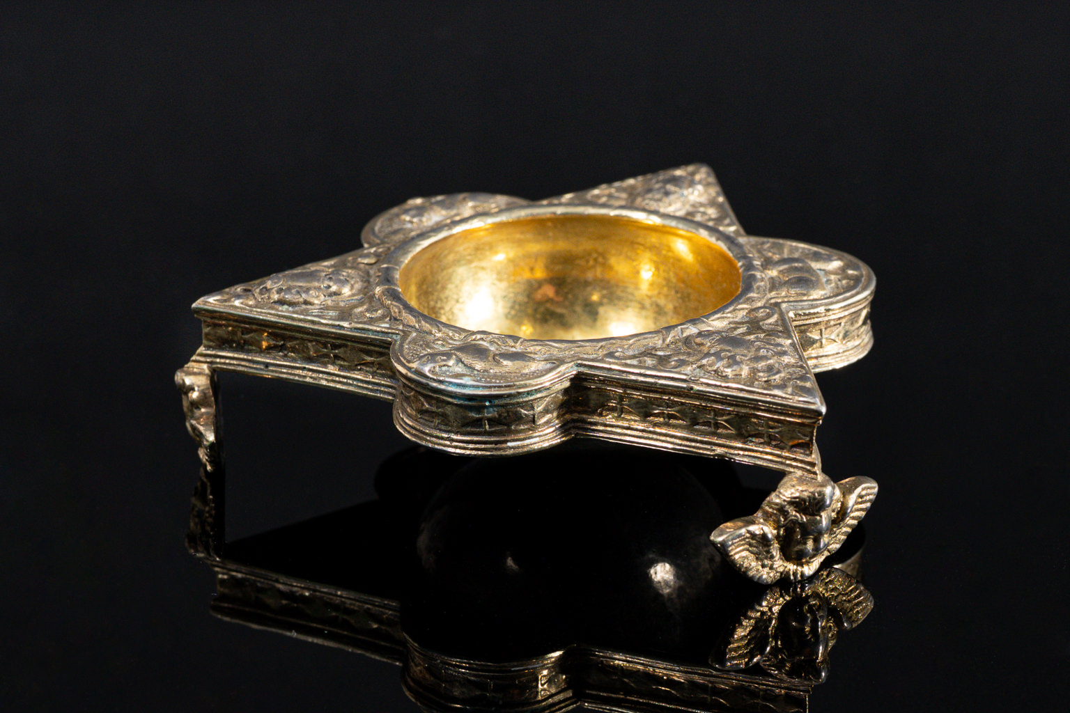 A fine silver gilt Salt; Nuremberg c.1550 to 1570; of triangular shape with a foot at each corner decorated with a winged cherub; the central circular bowl has raised decorations around it consisting of a dog, a cat and a rabbit, each with a cherub head in between.