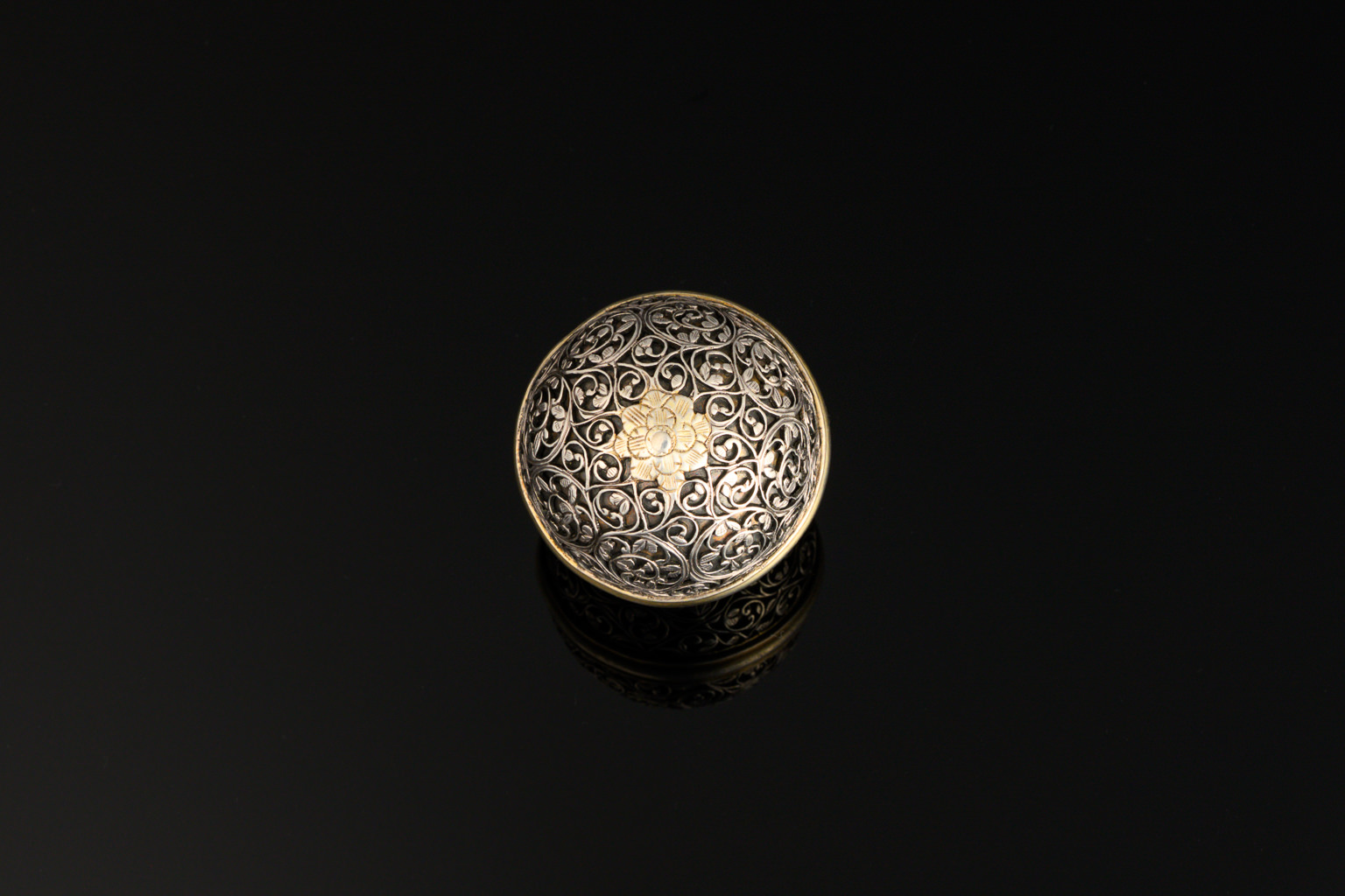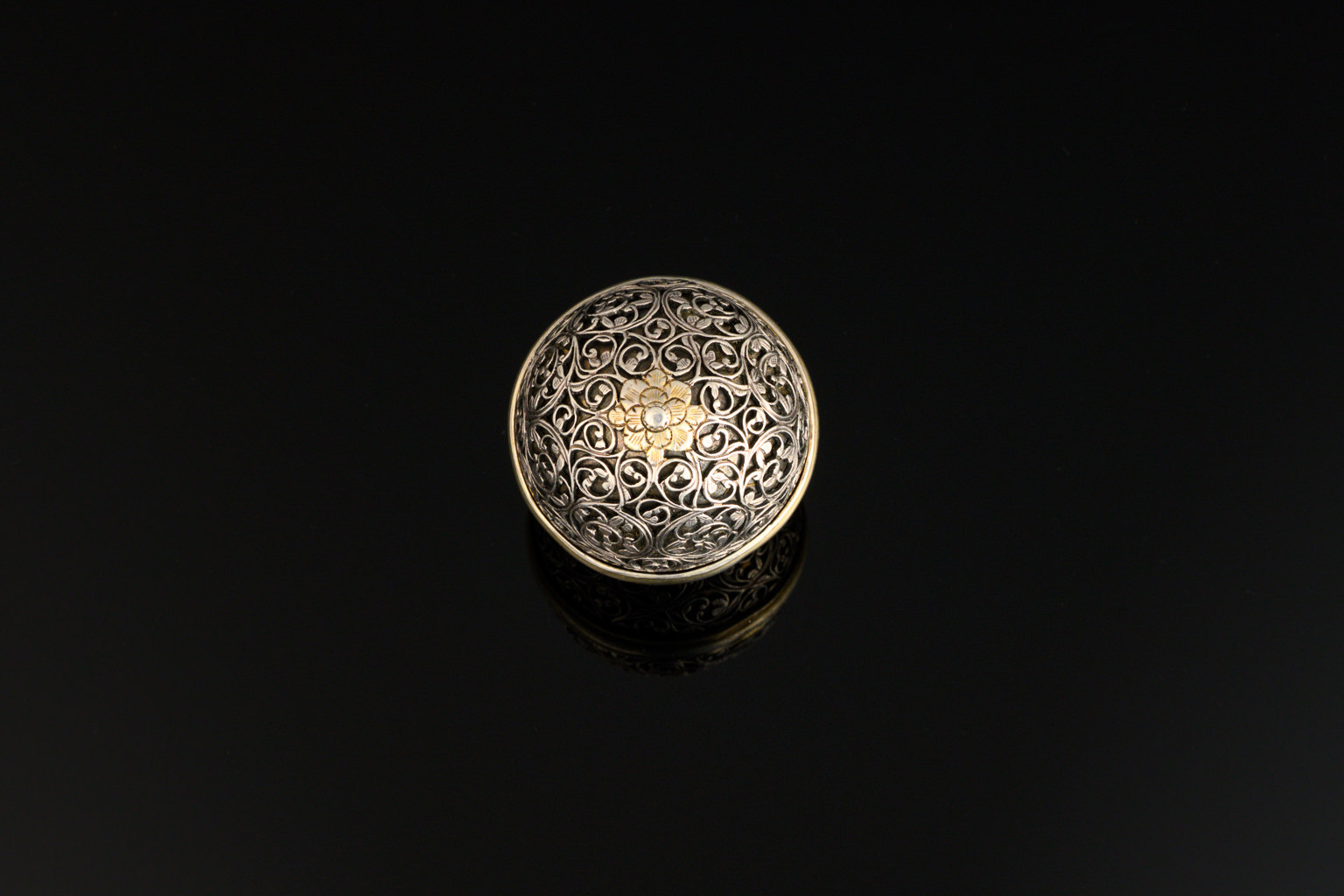 A little Indo-Portuguese bezoar stone holder, silver and parcel gilt;c.1690, probably Goa; of ovoid form with two interlocking halves; gilding to the central ring; each half has a plain silver lining, and the thicker outer shell with typical pierced foliate decoration; each end has a gilded rosette motif.